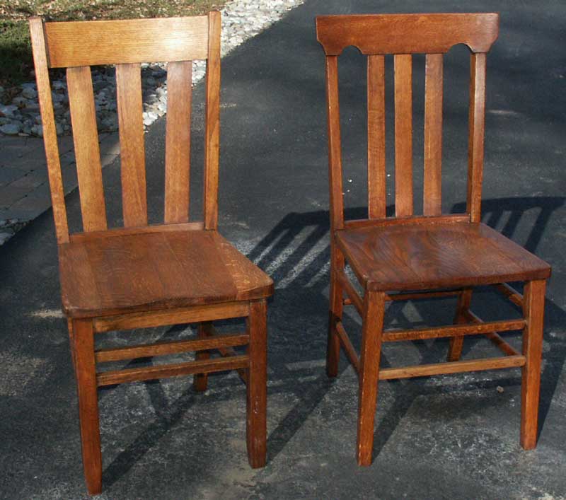 These two golden oak chairs arrived unfinished and weak. We disassembled them, rebuilt them, and applied a fresh finish.