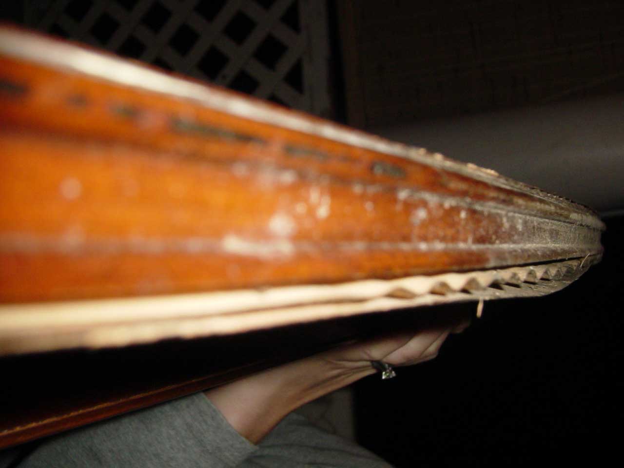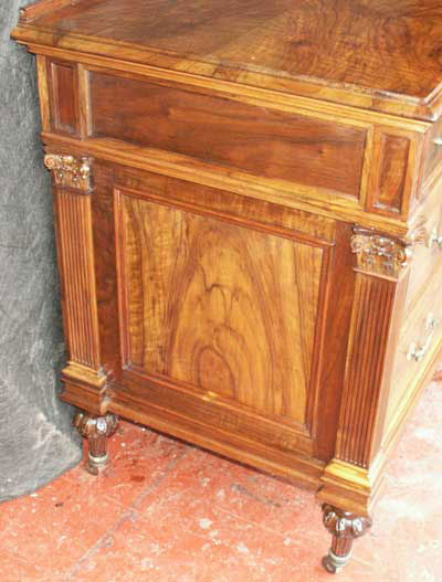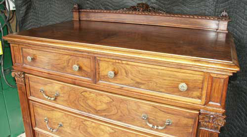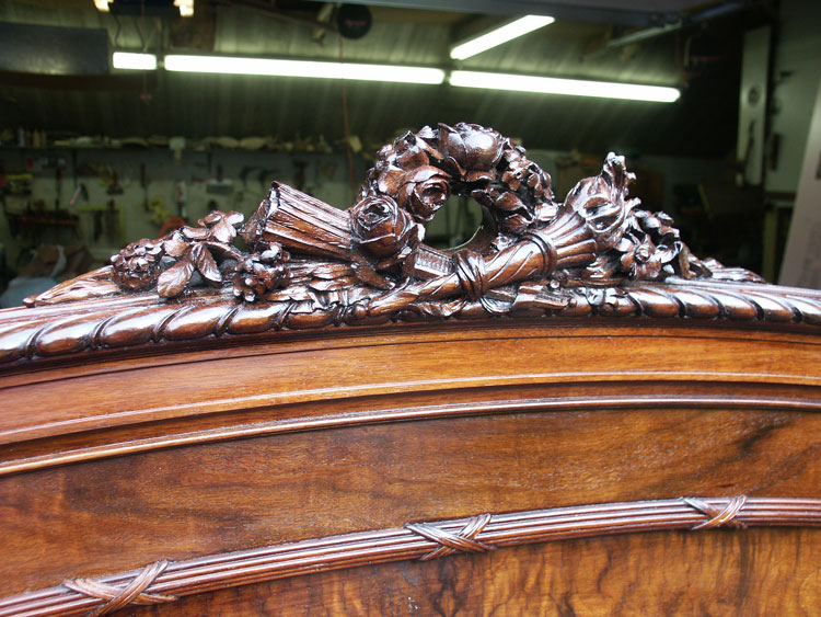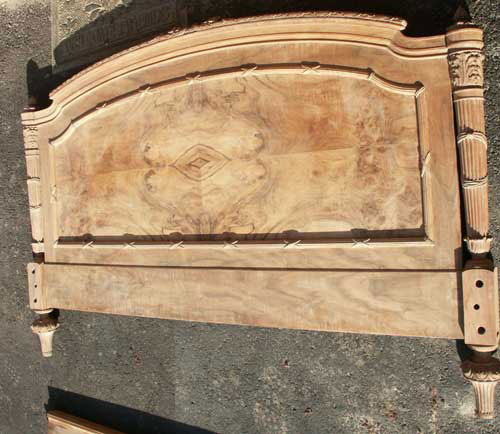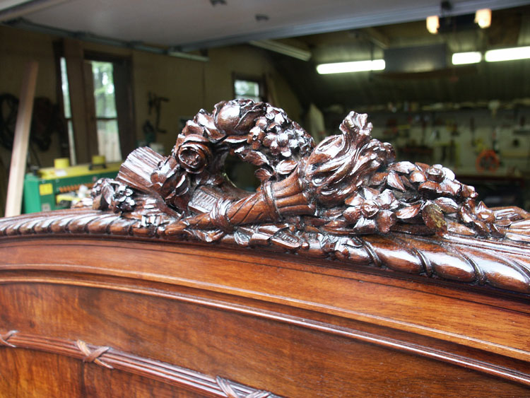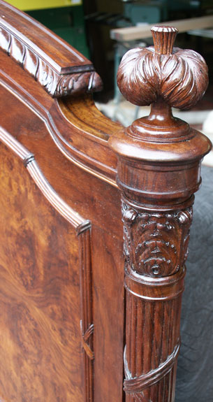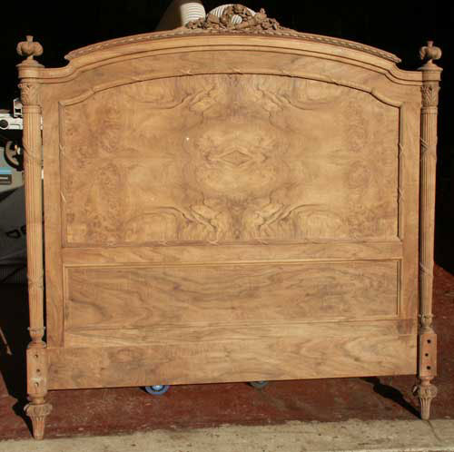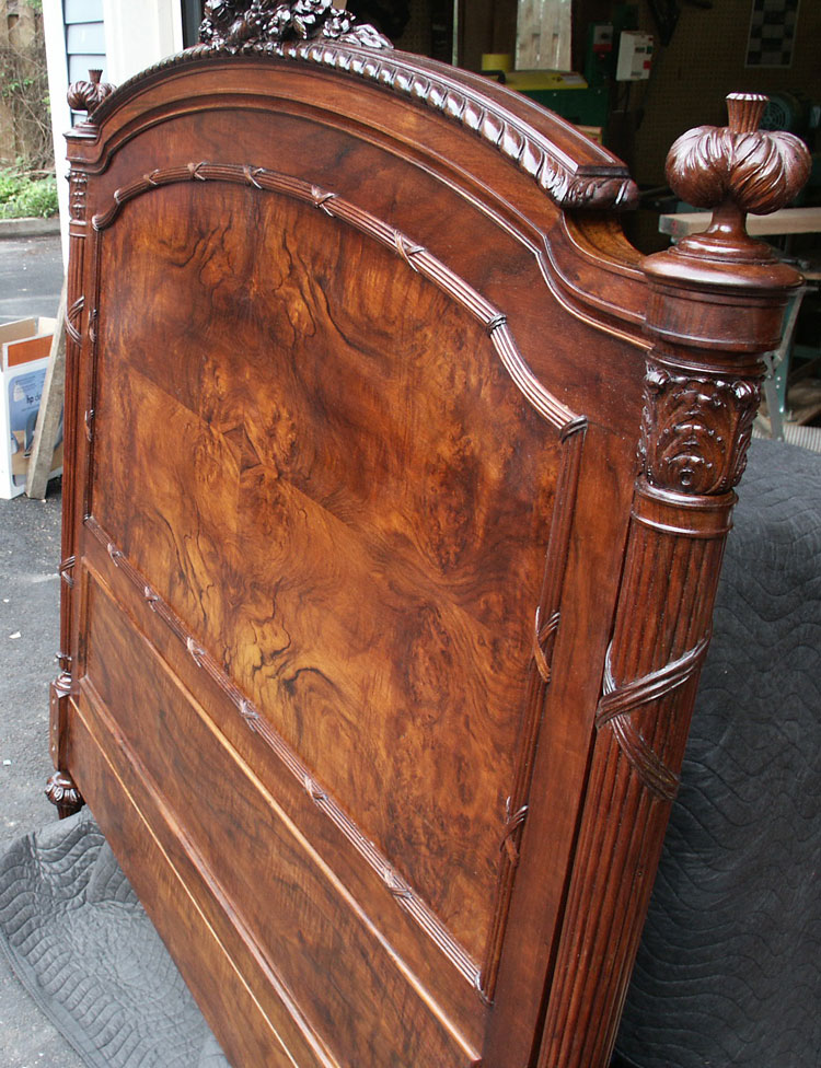 Before and after photos of the bed show the power of finish to bring out the outstanding grain patterns of these pieces. We were very pleased with the results, and we will happily work on furniture of this quality even though they are not antiques.