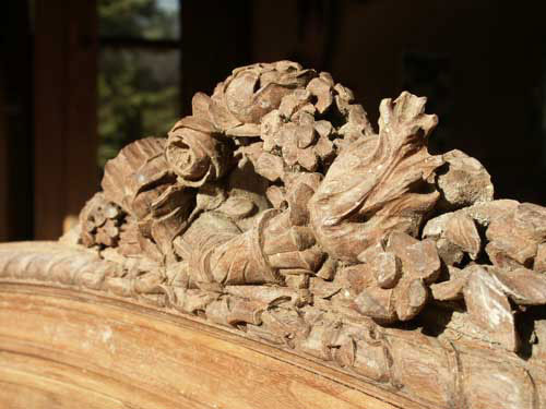 If you don't know just the perfect spot to look, you'll never notice this lid was ever split. We refinished the unit in a hand rubbed satin tung oil, brining out the carving and eliminating the previous glare issue on the piece.