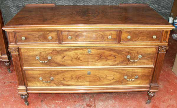 The original lacquer finish on this bedroom set was dry and cracked, and the units in need of attention. What makes these particularly special is they are perhaps the best quality machine made furniture we ever restored. The solid wood pieces have all mortis and tenon joints and a beautifully crafted and matched walnut burl veneer. Even the insides are walnut or mahogany, with paneled frames between every drawer. Substantial, heavy, and works of art this set in restored condition is easily worth $15,000.