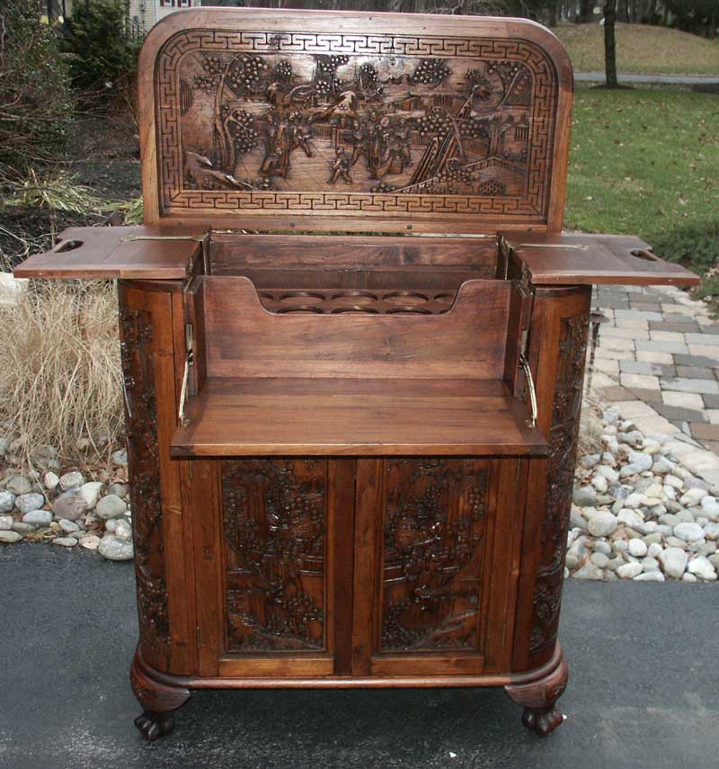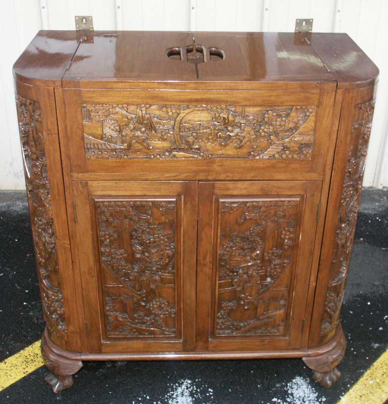 This is a unique piece, it's hand carved in mahogany, showing amazing detail and deep relief. This unit must have taken hundreds of hours to complete. Amazingly Asian made pieces hold a fraction of the value of their American or European counterparts, but the craftsmanship meets or exceeds Western standards.