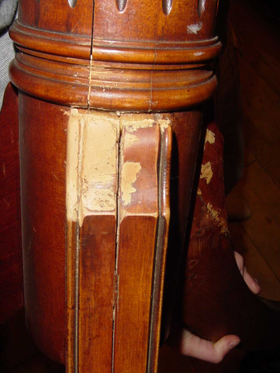 Before Restoration - Damage to feet and pedestals, common from chair bumps, vacuums, dog chews, etc. Surface finish was chipped, dry, crazing, and discolored.