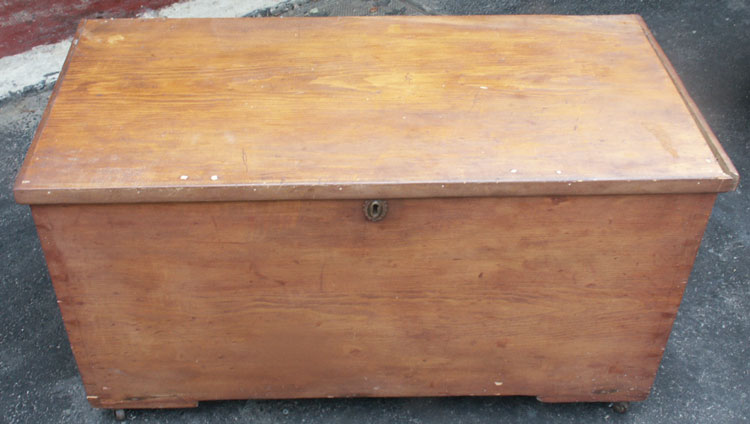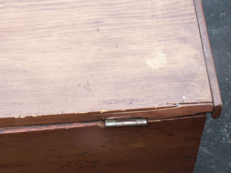 Simplistic, country rustic, pine furniture has an allure some can't resist. This hearty little chest survived quite a while, past pine's tendency to crack, warp, and twist resulting in much of the early furniture turning into firewood over time. Brought to us with broken hinges, a 1950's reddish finish, and dry as a bone.