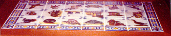 This unique table (top left) is a modern adaptation of country and colonial. Hand-painted Portuguese tiles of country items are the theme, set into an "I" Beam trestle table.